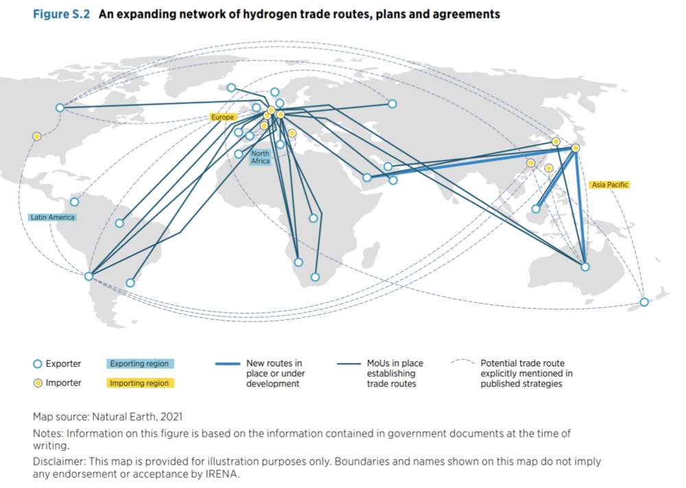 Regional and global hydrogen trade is in its early stages. Figure S.2 below provides an overview of the potential trade routes from green hydrogen exporting regions in Latin America, Asia Pacific, and Northern Africa crisscrossing around the world to major importers.